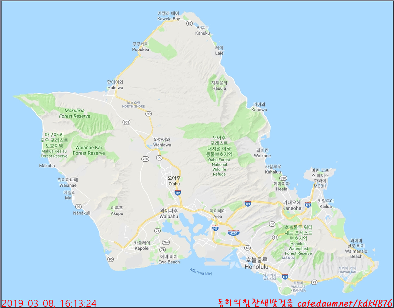 호놀룰루가 있는 오아후섬 지도