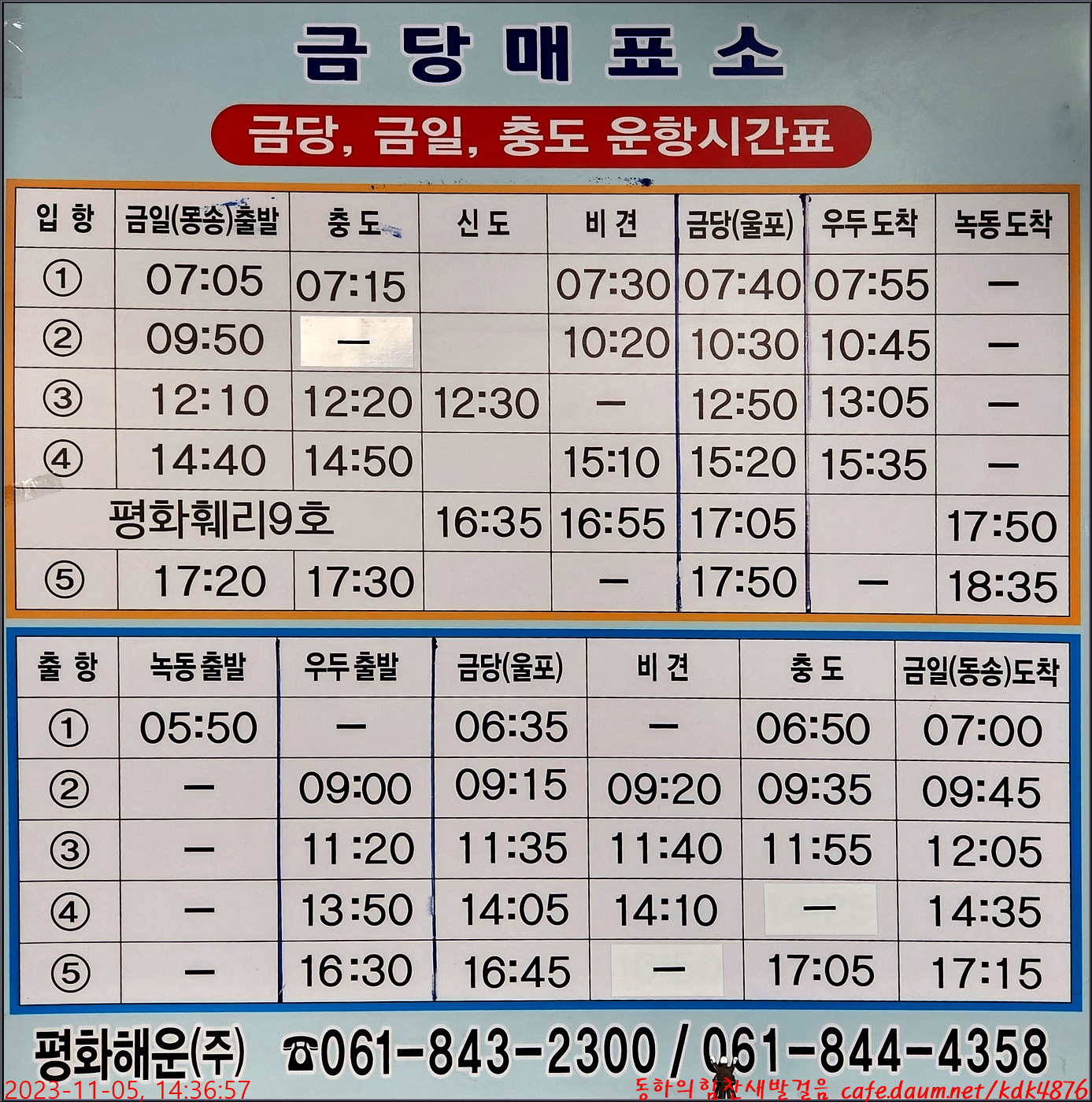 금당매표소의 운항시간표, 우리는 15;20분 배를 타고 나갈 겁니다.